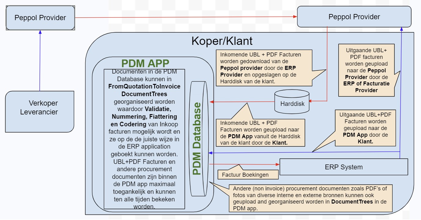 Het 2e schema is ook een weergave van het bekende vierhoeks e-facturatie model maar nu op basis van het PDM e-facturatie model. Het kenmerkende en doorslaggevende verschil waarmee de PDM app zich onderscheidt van voorgaand e-facturatie model is, dat de procurement documenten niet als bestand of journaalpost, maar als Document in de PDM database opgeslagen worden. De documenten die in de PDM app opgeslagen worden kunnen op elk gewenst moment als document gevisualiseerd worden binnen de PDM app. Tevens worden documenten binnen de PDM app aan DocumentTrees van aan elkaar gerelateerde (VanOfferteTotFactuur) documenten “opgehangen”, zodat elk document ten alle tijden in samenhang met zijn gerelateerde documenten beoordeeld kan worden.