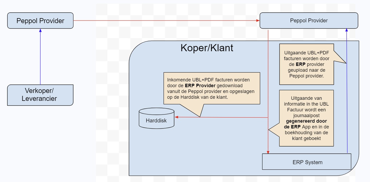 Het 1e schema is een weergave van het bekende vierhoeks Peppol model waarbij e-facturen via Peppol providers van leverancier naar klant gestuurd worden. In dit schema wordt sterk ingezoomd op de klantrol zodat goed zichtbaar is hoe de facturenstroom bij de klant verloopt wanneer geen gebruik gemaakt wordt van de PDM app.